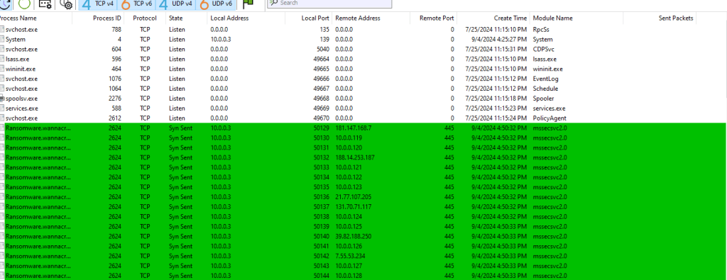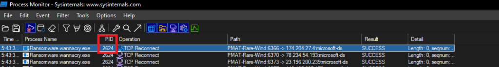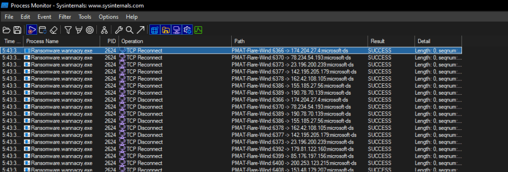 Lets start by filtering on the name of the executable => ProcessName contains “wanna”. We see the malware attempting network connections to several IPs. This validates the traffic seen in the TcpView output above.