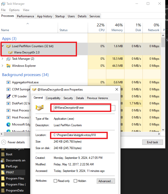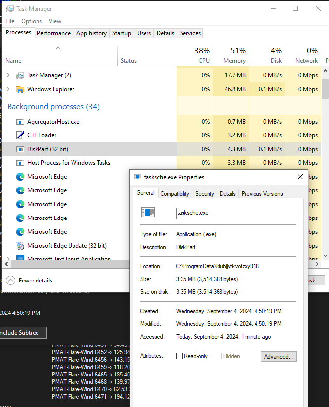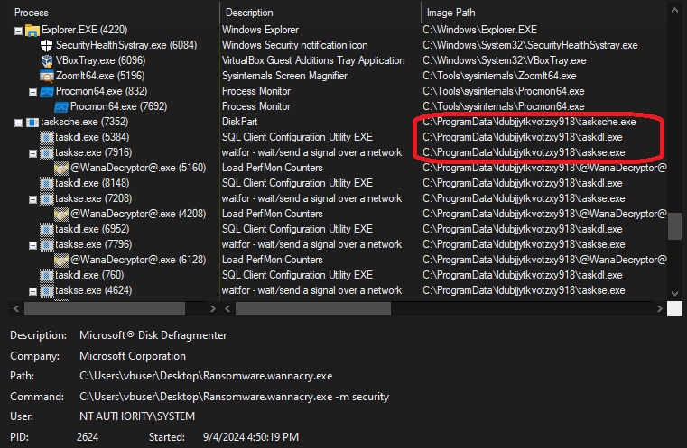 There is a background process that runs the encrypter (tasksche.exe). It is named “DiskPart.exe” to avoid immediate visual detection.