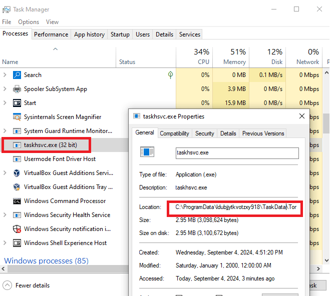 We also see a process named “taskhsvc.exe” which actually points towards the Tor browser binary in the malware directory.