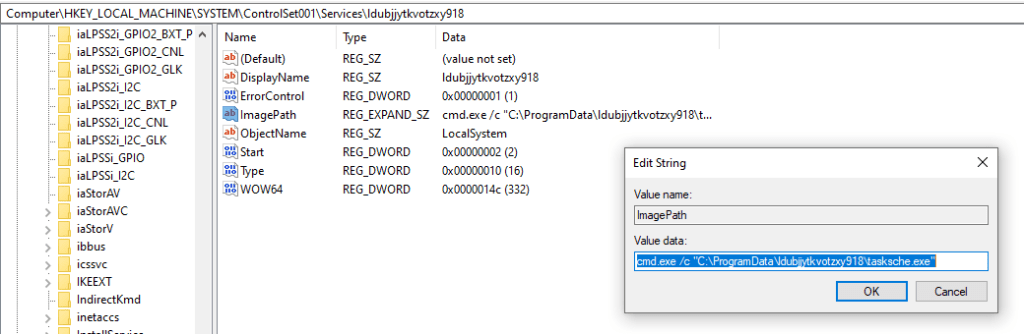 We also notice a Windows service with the same name as the malware directory. This points to the same binary as the encrypter component of the malware.
