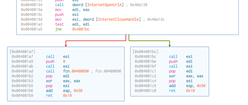 EAX contains the return value of InternetOpenUrlA . This value is moved to EDI. EDI is then tested and the code either jumps to detonating the code (0x004081a7)  or to exiting (0x004081bc) depending on this final value in EDI.