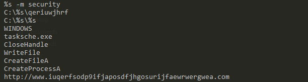 Perhaps the most interesting strings – Execution of a binary with -security, several references to c:\ and c:\Windows, tasksche.exe, file creation API calls and a suspicious looking URL