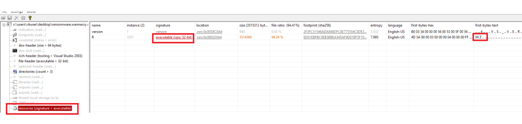 PE View displays an embedded executable (with the MZ magic header) hidden inside the resources section.