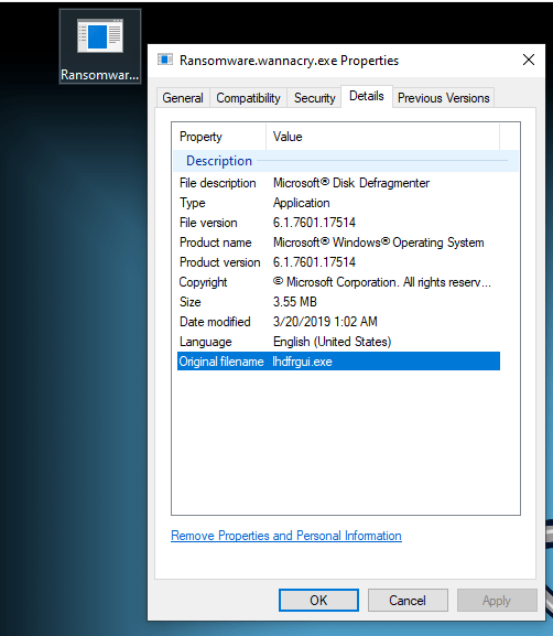 The malware binary’s original file name attribute is set to allow it to masquerade as a legal Windows binary a.k.a. the Windows Disk Defragmenter.