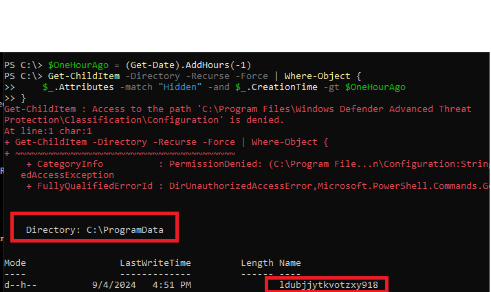 $OneHourAgo = (Get-Date).AddHours(-1) Get-ChildItem -Directory -Recurse -Force | Where-Object { $_.Attributes -match "Hidden" -and $_.CreationTime -gt $OneHourAgo }Run in an elevated powershell terminal in c:\