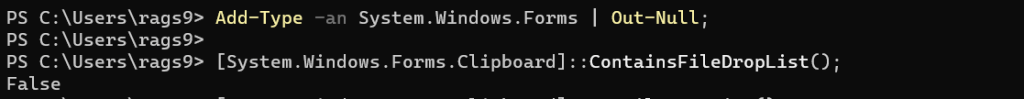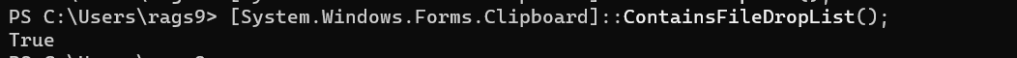 PS> Add-Type -an System.Windows.Forms | Out-Null; PS> [System.Windows.Forms.Clipboard]::ContainsFileDropList();