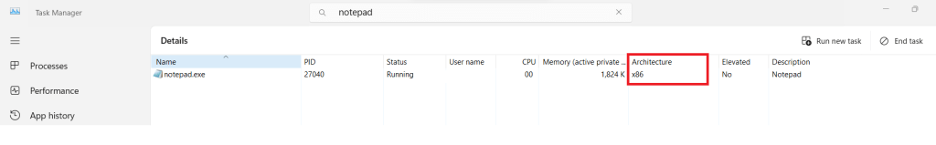 Let’s run the 64 bit version of Notepad.exe to verify this.