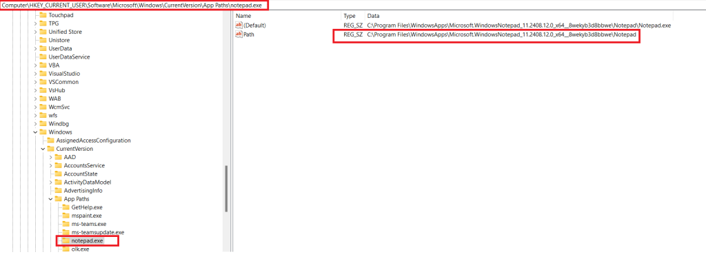 Computer\HKEY_CURRENT_USER\Software\Microsoft\Windows\CurrentVersion\App Paths\notepad.exe