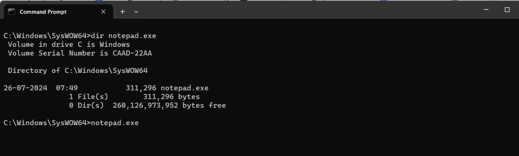 C:\Program Files\WindowsApps\Microsoft.WindowsNotepad_11.2408.12.0_x64__8wekyb3d8bbwe\NotepadClearly a different 64 binary is being invoked when the drive:\Windows\SysWow64\notepad.exe binary is executed.