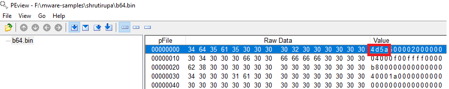 We clearly see the presence of 0x4D5A – the PE magic header, indicating that the Base 64 decoded file is a Windows Executable.