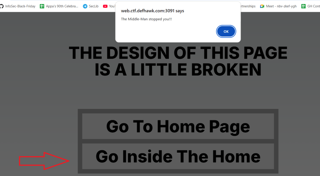 The CTF link provides the following description: “You land on a homepage that looks harmless — just a dummy page. But when you try to move forward, a pop-up warns: “The Middle Man Stopped You.” Craft the right HTTP request to slip past the middleman. Look for a server specific public exploit.”