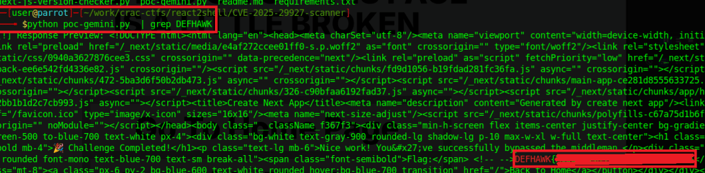 Gemini was resourceful enough to craft a Python POC that supported payloads for multiple vulnerable versions of Next.JS. Though it is probably overkill for a challenge like this, I am adding it here for future reference.