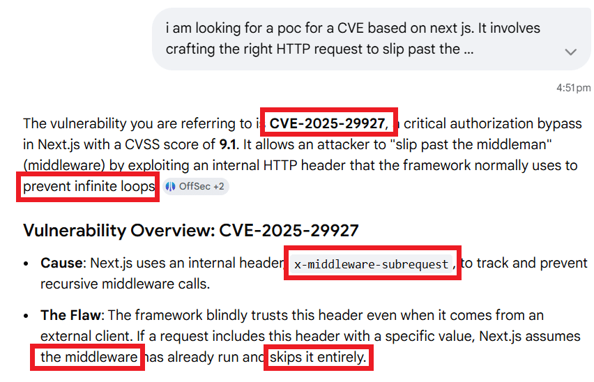 Gemini reveals a wealth of information, zeroing in on the exact CVE and also revealing the exact HTTP header that can be used to exploit this vulnerability.