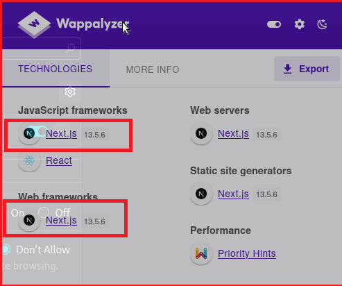 To find the exploit, I need to know what I am going to exploit. Wappalyzer does a nice job of revealing the framework used behind the URL.- Next.JS 13.5.6. As we will see later, the version information is critical in crafting the correct payload.
